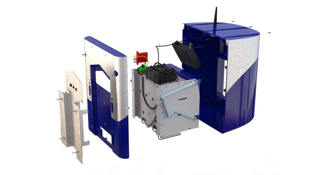 The OPT housing also needed to contain the power supplies for the payment terminals as well as wireless routers to boost the signal on the forecourt. Because of Engen's proliferation of fueling stations, thousands of housings were required in order to cover all locations countrywide. It was therefore economical to use a combination of injection moulding and sheet metal fabrication for the manufacture of the housings. The overall design of the OPT housings was matched to the current brand ID of Engen's forecourts, incorporating a rounded front form and a cosmetic stainless steel shroud that mirrored the curved profiles of the rest of the forecourt furniture. The housing was also kept as compact as possible to make the most efficient use of the materials without compromising usability. This meant that a novel hinge design needed to be designed in order for the door to open in a tight space while clearing all the internal components. Springs were incorporated into the door mechanism to hold the door in the open position.