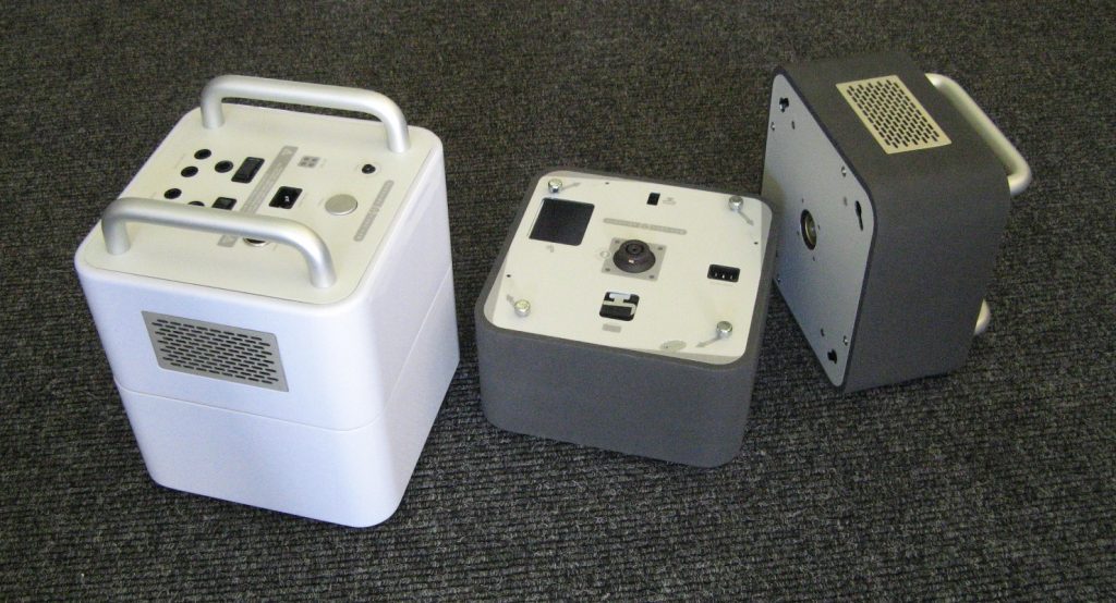 The interface of the Power Cube offers two 240V 3 pin power outlets as well as a 12v outlet, a power switch and a charging point for charging the batteries. The battery could be charged with the cube assembled or separately and the charge indicator lights made use of fibre optic light tubes to transmit the light up to the user interface when the cube is assembled.  Working in collaboration with electronic engineers to develop the electronics, the final design was a beautifully resolved product that was easy to understand and use.